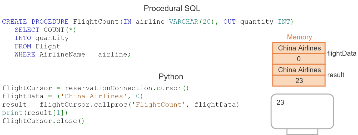 - callproc() 메서드는 flightData 입력 튜플을 사용하여 FlightCount를 호출하고, 출력 튜플을 result에 반환한다.