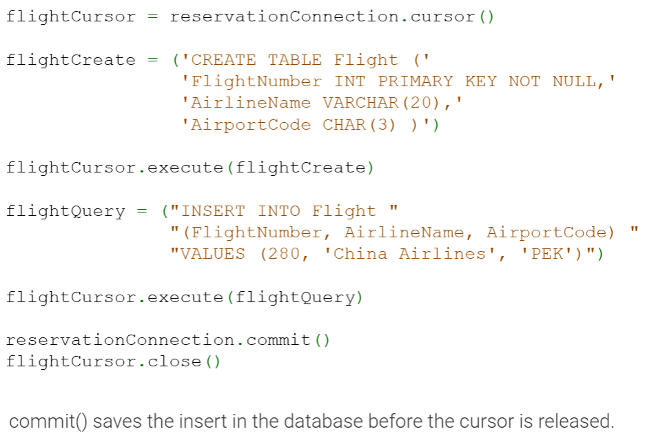 flightQuery = ('UPDATE Flight SET AirlineName = "' + airline + '" WHERE FlightNumber = ' + flightNum) flightCursor.execute(flightQuery)▼View solution