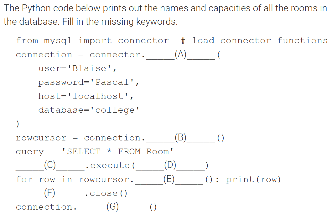 더보기from mysql import connector # load connector functions connection = connector.connect( # A user='Blaise', password='Pascal', host='localhost', database='college' ) rowcursor = connection.cursor() # B query = 'SELECT * FROM Room' rowcursor.execute(query) # C, D for row in rowcursor.fetchall(): # E print(row) rowcursor.close() # F connection.close() # G(A) connect (B) cursor (C) rowcursor (D) query (E) fetchall (F) rowcursor (G) close