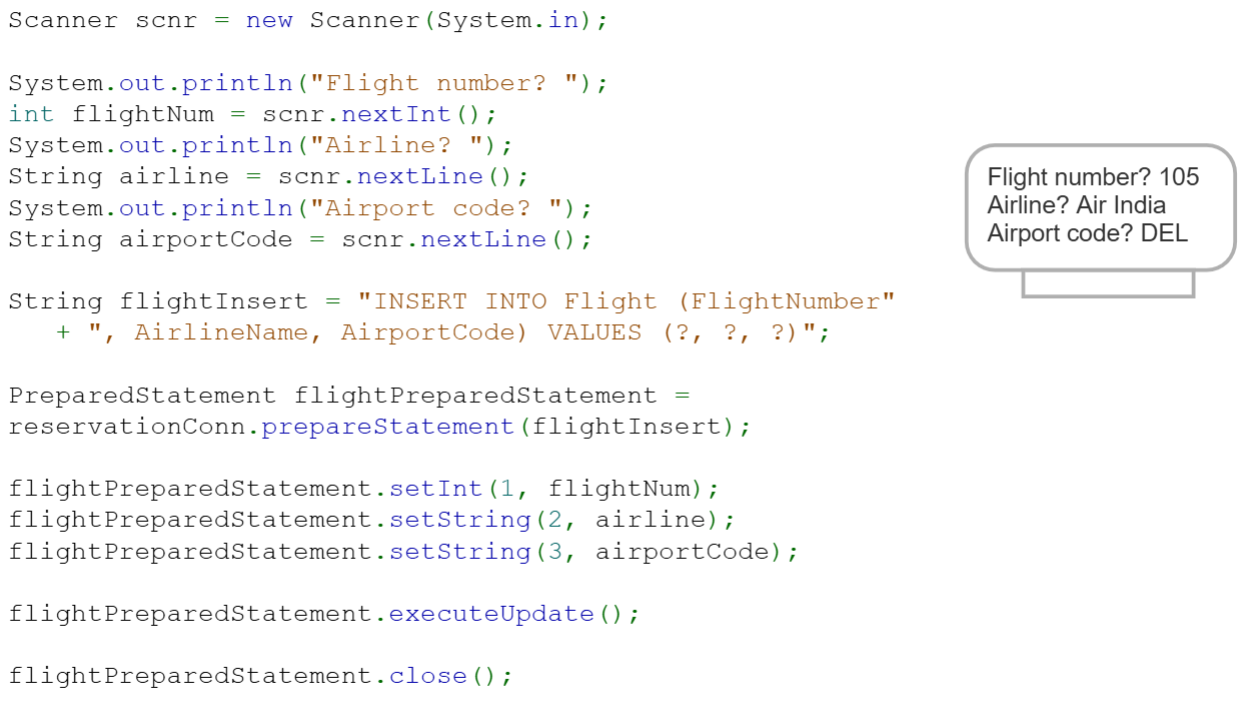 - PreparedStatement 객체는 flightInsert 문자열에 있는 SQL 문으로 생성된다.